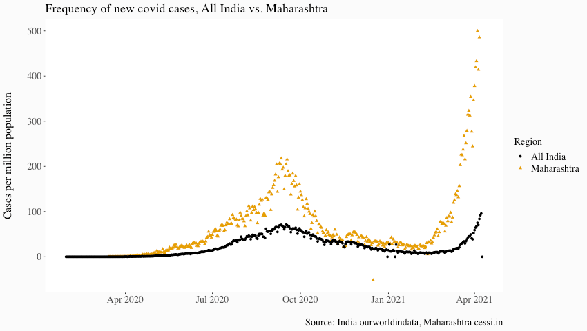 According to the Johns Hopkins Covid Tracker, India is third behind the US and Brazil for number of confirmed Covid-19 cases, with over 13 million since the pandemic began. Worryingly, they are currently experiencing the highest number of confirmed new daily cases anywhere in the world. Because of India’s vast population – at 1.38 billion people they make up almost one in five of the world population – case numbers are still relatively low on a per capita basis, but the increase over the last month has been a near vertical line. That rise is largely driven by an increase in cases in the western peninsular state of Maharashtra. Maharashtra is the second most populous state in India and home to the city of Mumbai, considered to be the financial, commercial, and entertainment capital of India. The state is already under a weekend curfew, but it sounds like more restrictions may be on the way.