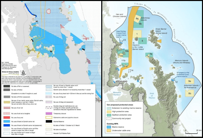 Looking at the map of commercial fishing regulations in the entire Hauraki Gulf Marine Park (which extends out beyond the Coromandel), it’s clear that every inch of it has some restriction in place (below left).