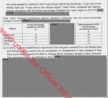 The issue is so embarrassing for the National government that they have had to redact both their internal discussions and advice from the United Nations Refugee Agency (UNHCR) on the matter. I am confident that the redacted middle column in the table below will have the UNHCR’s recommendations to significantly increase our intake from Africa above the 1% taken in 2014/15.