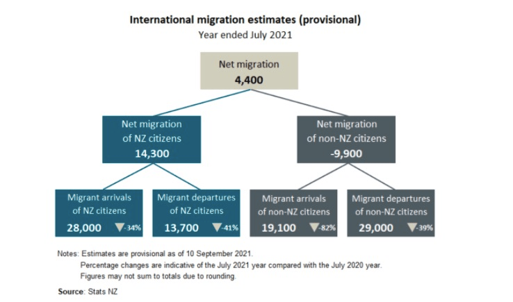 About three-quarters of those arriving are New Zealand residents or citizens. Which means, for the first time in a very long time, New Zealanders provide the net migrant gain. There has been a net gain of 14,300 New Zealanders and a net loss of 9,900 non-New Zealanders from July 2020-July 2021. For the last decade, the number of New Zealanders departing to live in another country exceeded those arriving back in the country.