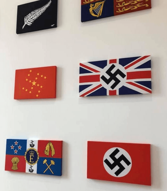 So what caused such outrage? Let’s go back to the exhibition itself, where among the many, many swastikas were other far right symbols: some obvious, such as a sign saying “it’s okay to be white”, and others more obscure, such as the Sonnenkreuz, Sonnenrad, Vichy French and Spanish Falangist flags. In fact, it was hard to think of a fascist flag that wasn’t there. Worse, these were displayed alongside the tino rangatiratanga flag, the United Tribes flag and Tūhoe’s mana motuhake, all apparently without permission from tangata whenua.