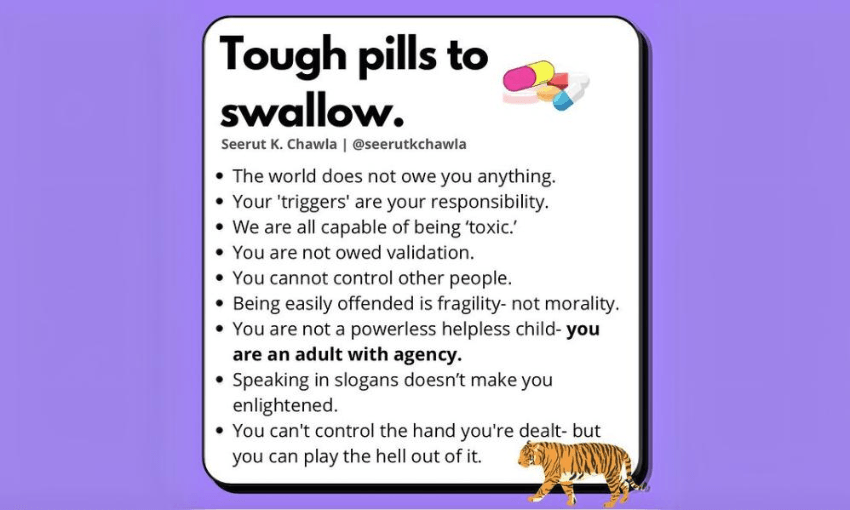 This pronouncement is based mostly on me licking my finger and sticking it in the air, but here are some of the breezes I’m feeling: last year, Time Magazine announced that we’d hit “peak therapy” and The London Evening Standard signalled “the end of therapy speak”. Freddie de Boer, a US-based writer who frequently rails against “therapeutic maximalism”, has written about its weakening grip on the culture. Seerut K. Chawla, a London-based psychotherapist who criticises “Insta-therapy”, has a growing following of almost 300,000 people on Instagram. And on our own shores, Dr Jonathan Shedler, a prominent US-based psychoanalyst, went on Kim Hill’s Saturday Morning show last September to discuss the clinical perils of overusing therapy speak.