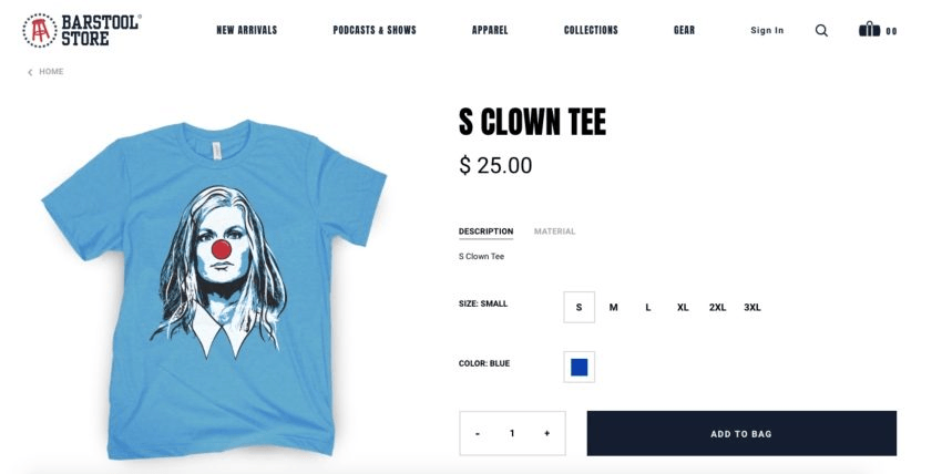 The feud between Portnoy and Ponder flared up again when Ponder said on her Instagram that she didn’t ask for Barstool’s ESPN show to be cancelled. Portnoy and Katz claimed she was lying. There is now a t-shirt available in the Barstool online store showing Ponder with a clown nose.