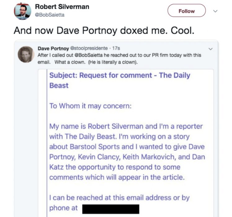 Daily Beast writer Robert Silverman was compiling a report on Barstool and an alleged culture of sexual harassment. Silverman reached out to Portnoy through a representative for comment. Portnoy tweeted a screenshot of the email, including Silverman’s phone number, to his 740,000 followers, who then flooded his voicemail with abusive messages.