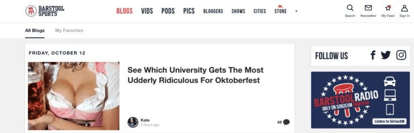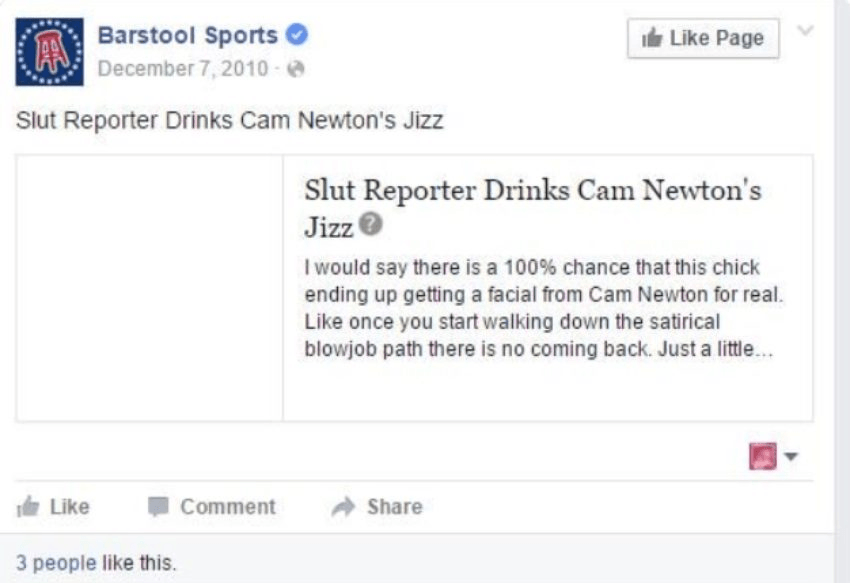 It’s just satire! It’s not what we’re really like! But a scroll through Barstool reveals that much of what it publishes is not satire, and not comedy. It’s just gross. And to claim that it is a satirical website is beyond disingenuous.