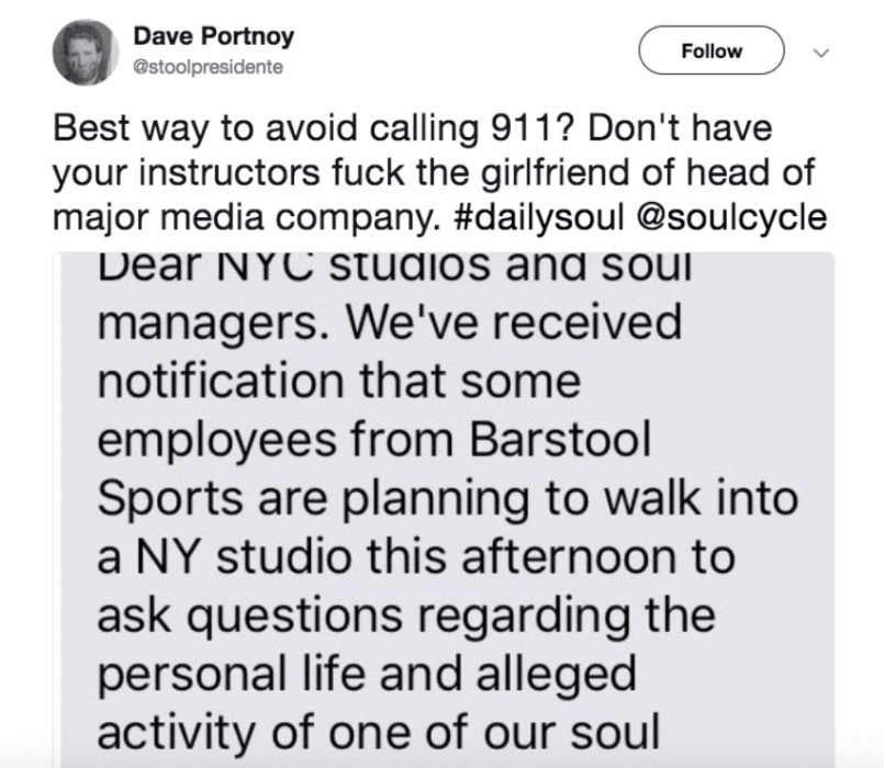 Portnoy said his girlfriend cheated on him with her SoulCycle instructor. To retaliate, Portnoy created a lot of content around what he named #CuckCycle, even selling t-shirts with the name. His many fans trolled SoulCycle’s social media until they were forced to disable comments on Instagram and send out a notice to all New York employees to watch out for Barstool fans who had threatened to disrupt their classes. Portnoy of course tweeted about it.