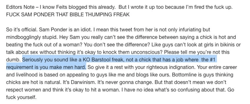 A Barstool podcast with Portnoy and Katz was published in which the two made their picks for week six of the NFL season. Included in the episode was this, about ESPN sportscaster Sam Ponder.
