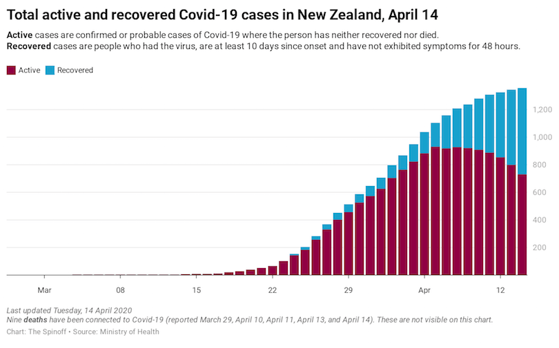 Each day of the Easter weekend saw new Covid-19 cases being announced, with none of the updates suggesting it was getting out of control. Sadly, there have been several more deaths, bringing the total toll to five so far. The latest numbers have been charted here, with 1349 cases in total, and 546 recoveries to date. Other news updates from Monday and the weekend can be found here, and we’ve transcribed a series of questions and answers from the public to Dr Ashley Bloomfield.