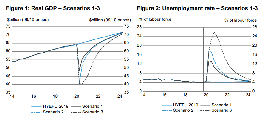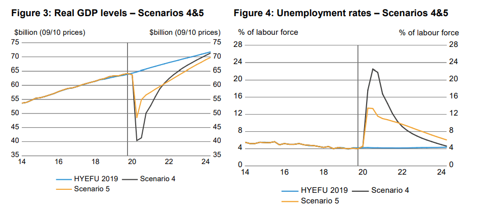 The scenarios range from, at best, unemployment remaining below 10% and returning to 5% in 2021. The worst case scenario imagines unemployment rising as high as 26%. Treasury suggests economic growth measured against 2019 will not be seen until 2024.