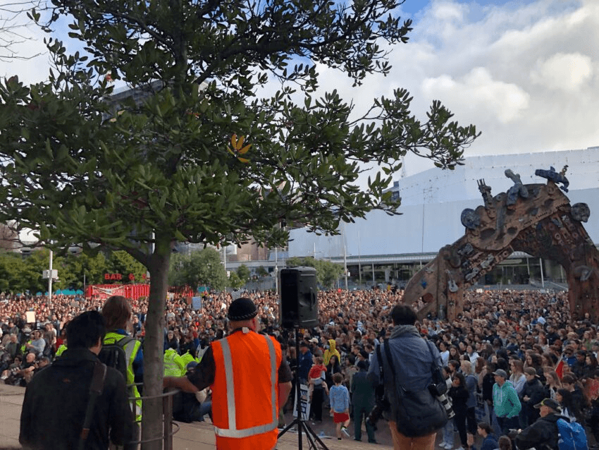 A large crowd, slightly smaller than a fortnight ago, has gathered in Aotea Square.