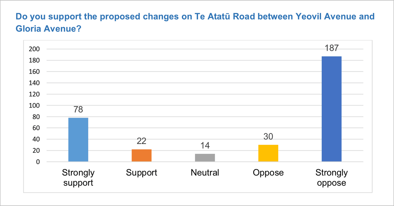 Sure enough, around 65% of 331 responses (the suburb had a population of 13,000 at the last census, probably more like 15,000 now) to the official feedback process said they either “oppose” or “strongly oppose” the proposed transit lanes on Te Atatū Road:
