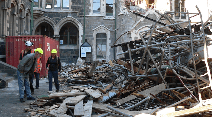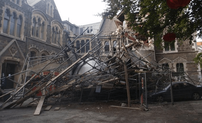 “When the February quake struck, the tower completely pulled away from the building and fell down,” Pollard recalls. “Of course, I didn’t know that for a couple of days.” It was only when she received some photos from a colleague involved in Urban Search and Rescue (USAR) that she was able to see the true extent of the damage to the Arts Centre. “I was absolutely horrified, but I could see that the observatory dome was still intact, and the scaffolding was sitting straight on the ground, possibly cushioning the fall of the telescope.”