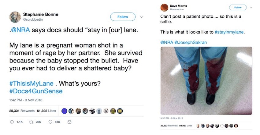 But some of the most effective and hair-raising tweets came from a large number of physicians who testified to the carnage wreaked by guns that they had personally witnessed. The stories of their patients. Horrific photos of blood-soaked gauze, the aftermath of trauma surgery on gunshot victims. It makes for grim reading.