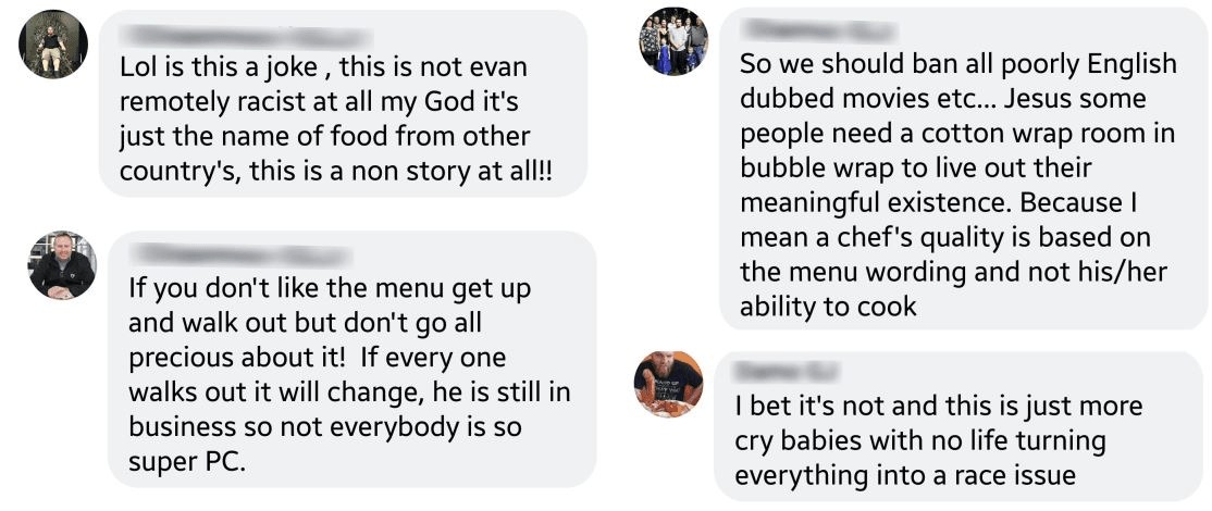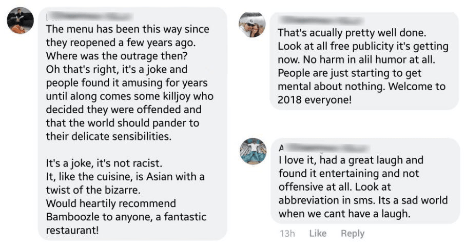 I could not be more wrong. The comments section was swimming with white people saying that the menu “wasn’t offensive” or that “it was just a joke” or that it was “hilarious”. One even went as far as to say that “they loved it” and that it actually made them want to eat there even more. It was like being in a racist episode of Black Mirror (or in this case, Yellow Mirror. I’m so sorry for this I promise I am a professional comedian.)