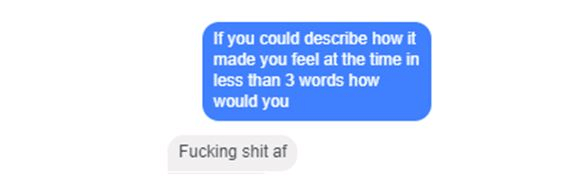 What did she do, I asked. She just looked away because she didn’t know how to respond, but they kept doing it anyway. When I pressed her to describe how it made her feel in three words, she replied in a way that not only perfectly encapsulates her frustrations with it all but also made me laugh out loud. The message said “fucking shit af”.