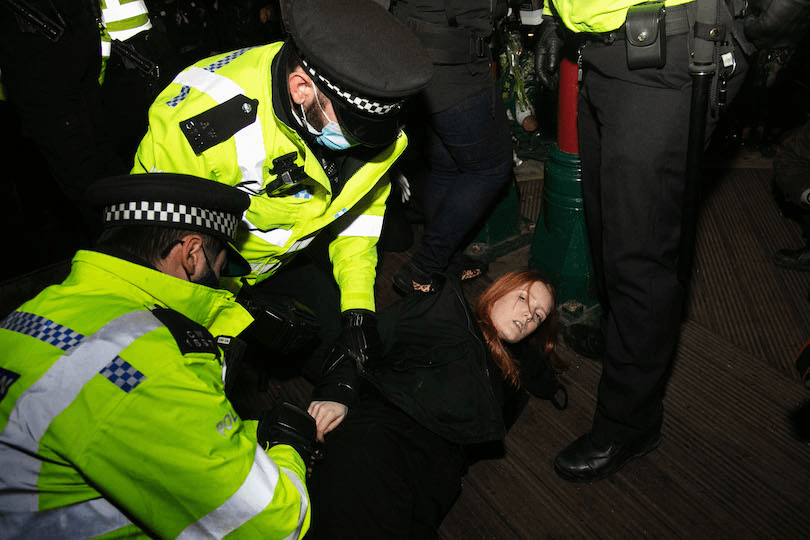One of the most notable images to come out of Saturday’s vigil was that of Patsy Stevenson being pinned to the ground.