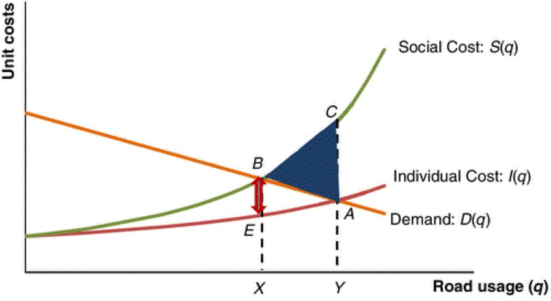 If you take a look at the diagram below which shows the social cost of congestion, at X, the social cost of road travel starts to include congestion impacts on other motor vehicles. If travel demand increases to Y, the congestion costs are shown by the blue triangle ABC. This is a deadweight loss – it cannot be used for anything else.