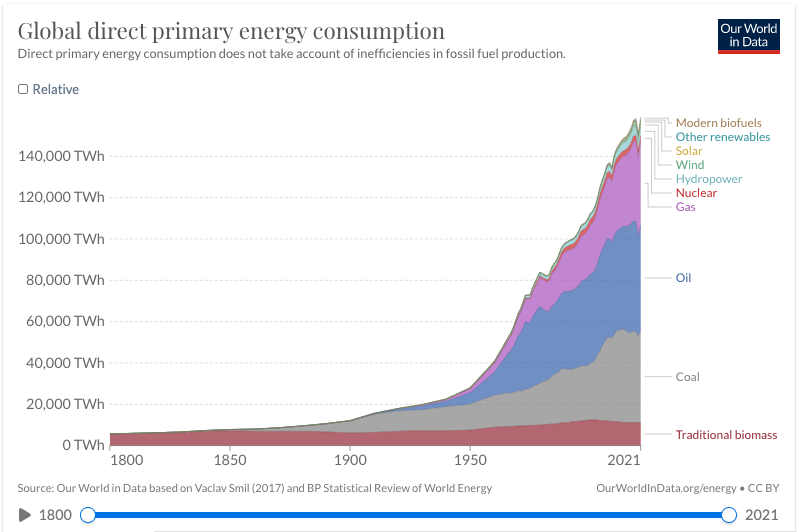 Which brings us to myth number 2: it is all under control because the transition to renewable energy is underway. Yes, year on year, the amount of solar and wind energy generation (and consumption) is growing in relation to itself. But in relation to overall global energy consumption, it remains just a tiny sliver. As of 2020, solar and wind energy combined made up only 1.6% of all energy consumed globally. This is because just as quickly as the renewable energy expands, our overall consumption of energy grows.
