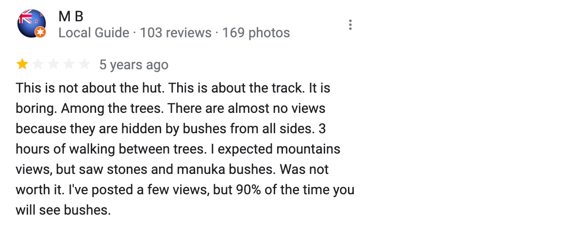 These are collected thoughts from people who have tramped some of the best tracks in the country and then thought: “that was shit… I’m going to leave a bad Google review”.