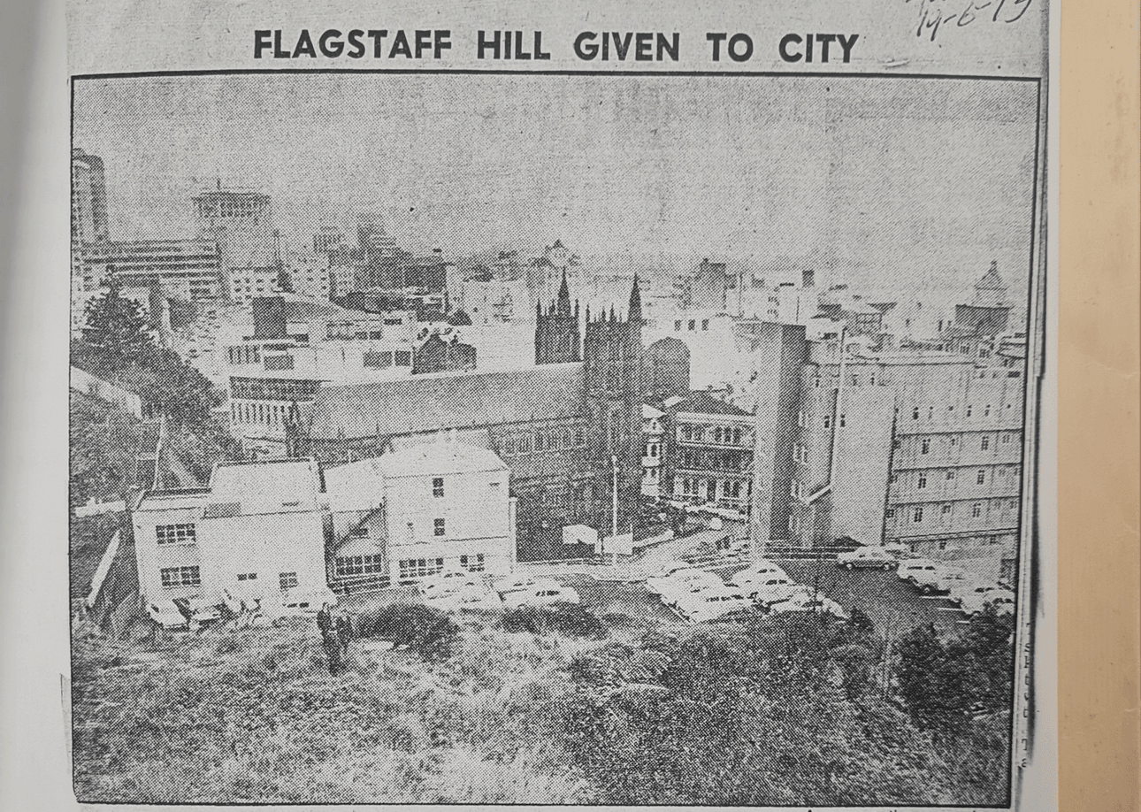 The hill then passed through various hands, including those of New Zealand Breweries and Massey University. The site of the original flagstaff became a car park in the 1970s, and is now covered in townhouses. Ironically, the current flagpole, erected in 1973 to commemorate the restoration of “historic Flag Staff Hill”, according to its bronze plaque, is some 50m away from the original spot.