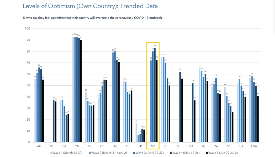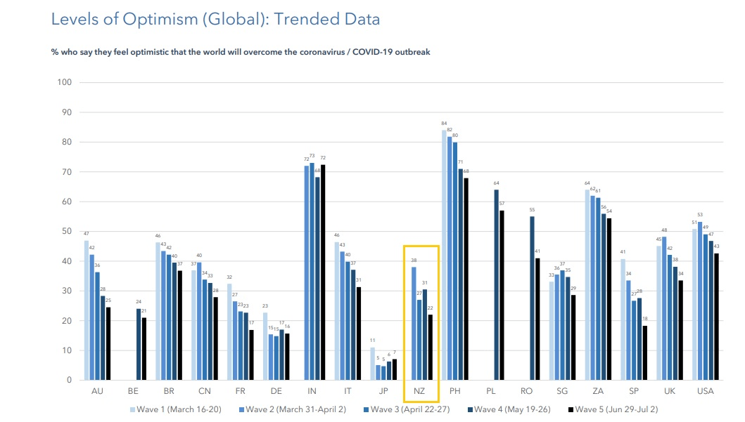 When it came to how we felt about the pandemic globally, just 22% of New Zealanders felt optimistic – down from 31% in May – presumably reflecting the worsening health crisis in countries like the US and Brazil. Across the Tasman, a fresh wave of infections swept through the state of Victoria in late June led to a second lockdown last week.