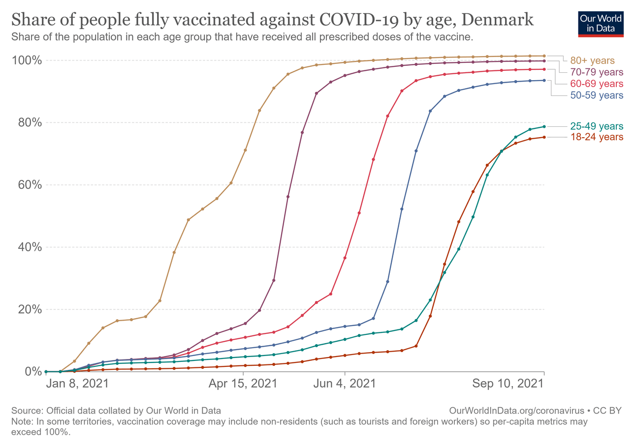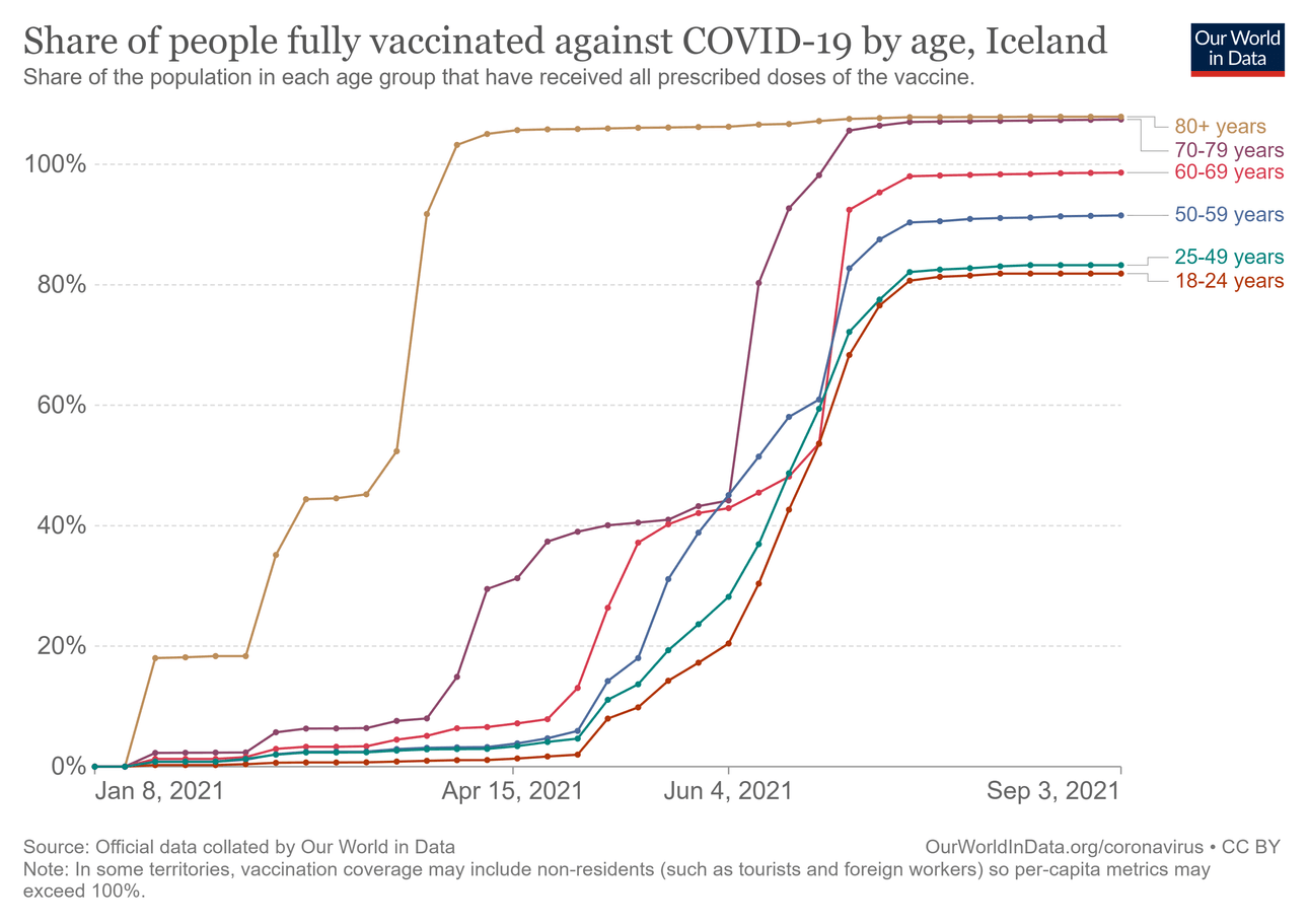 The percentages vary by country, but the pattern is the same. Stratifying the data by age, the older the age band, the higher the percentage of people who are vaccinated. In fairness, it looks like all these countries have had a similar rollout to New Zealand, vaccinating the oldest and those most likely to have a severe infection first, alongside people like healthcare workers. But even so, each age band seems to reach a plateau. Here’s a couple of examples, from Denmark and Iceland.