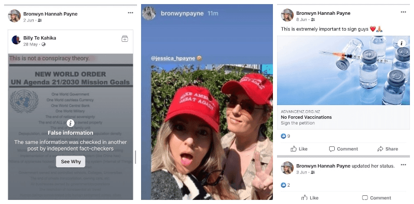 Alex said that night in early November had her on the verge of quitting, a decision confirmed by finding Bronwyn Payne was promoting dubious Covid-19 content on her personal social media – including posts from conspiracy theorist and aspiring politician Billy Te Kahika of Advance NZ. The sisters also appeared in a post on Instagram wearing MAGA hats. This was the last straw, said Alex. “It didn’t feel very welcoming.”