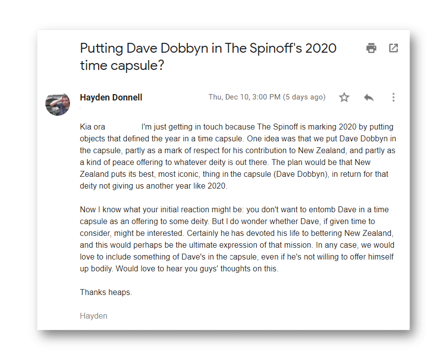 Nobody loves collecting up things and trying to put them in another thing like Hayden Donnell, who gloriously failed in his life mission to get a bunch of items of national significance into Te Papa Tongarewa. Who better to unleash on our new project: The Spinoff Aotearoa 2020 Time Capsule.