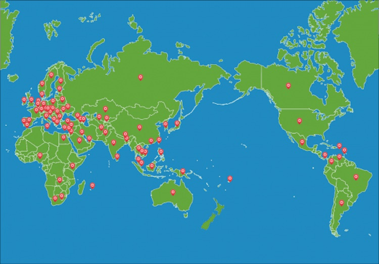 And in the map below the dots represent where the 83 countries and territories are located.