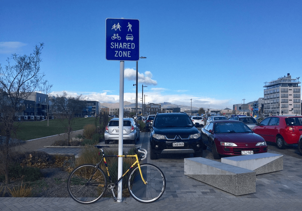 Huanui Lane and the park it bisects, Rauora Park, are part of the East Frame, a post-earthquake development in central Christchurch. When it opened, the laneway was a peaceful, quiet space for cyclists and pedestrians. Now it is choked with cars.