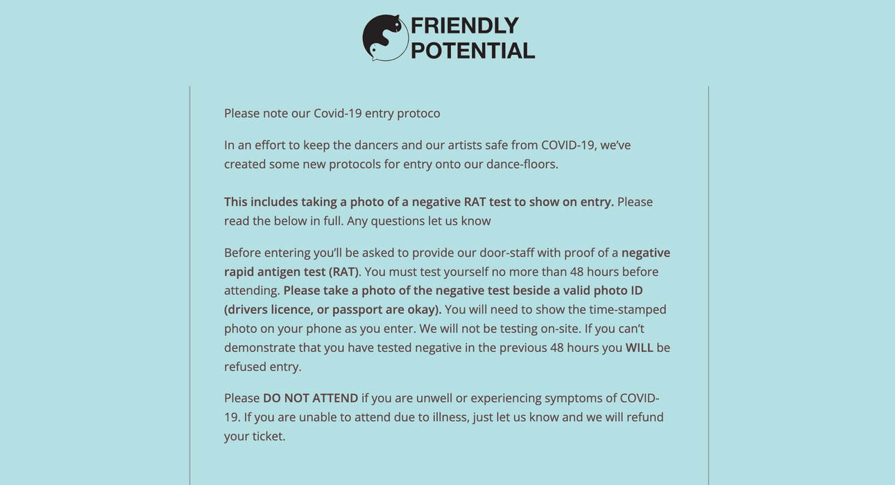 So how does the system work? At the time of ticket sale, the terms and conditions state that a negative RAT, taken less than 48 hours prior to the event, will be needed on entry. Ahead of the event, the group sends emails and advertises on social media to remind people of the testing requirement. At the door, attendees show a time-stamped photo on their phone of their negative RAT beside their photo ID. If you end up testing positive and can’t attend, the group will refund your tickets.