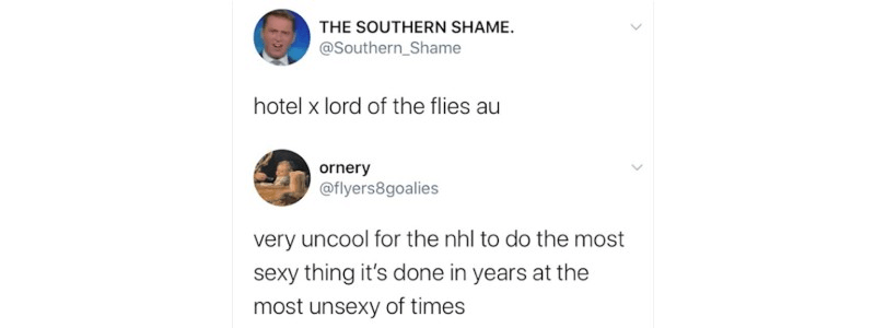 Then the NHL announced they would be going ahead with the 2020 playoffs by creating two bubble cities in Canada. And they would be housing all these teams of professional athletes that fight and hug each other for a living in a single hotel in Toronto called (and this is not a joke) Hotel X.