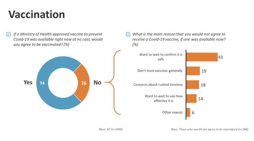Of the 26% who declared they would not take a vaccine, most wanted to wait until confirmation it was safe, expressed concern about the rushed timeline or wanted to wait to see how effective it was. Meanwhile, 19% (about 5% of all those surveyed) were opposed to vaccination in principle.