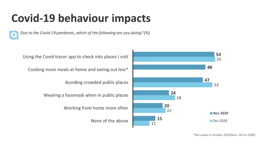 Aucklanders were ahead of the average New Zealand rating on all counts. This was especially the case around wearing a face mask when in public places – 42% of Aucklanders declared they were wearing a face mask when in public places compared to 24% of all New Zealanders. There was also a double-figure difference around cooking more meals at home and eating out less, with 59% of Aucklanders declaring they were doing this compared to 48% of all New Zealanders.