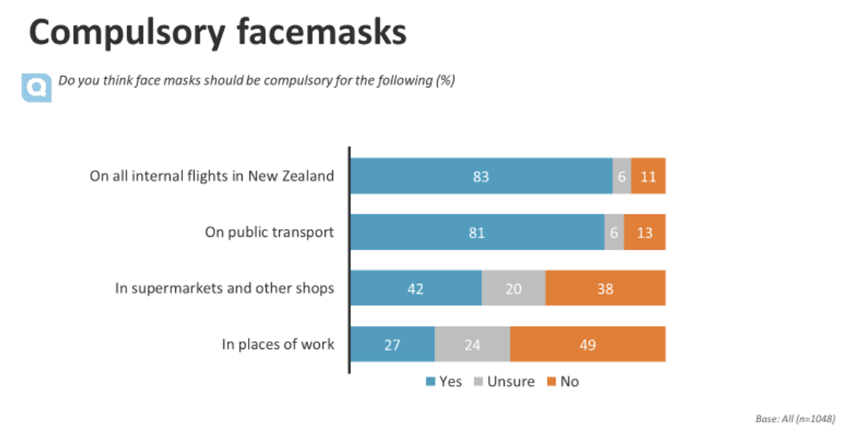 New Zealanders were mostly behind the compulsory wearing of face masks on all internal flights in New Zealand (83%) and on public transport (81%). We were more divided on having to wear face masks in supermarkets and other shops, with 42% in favour and 38% opposed.