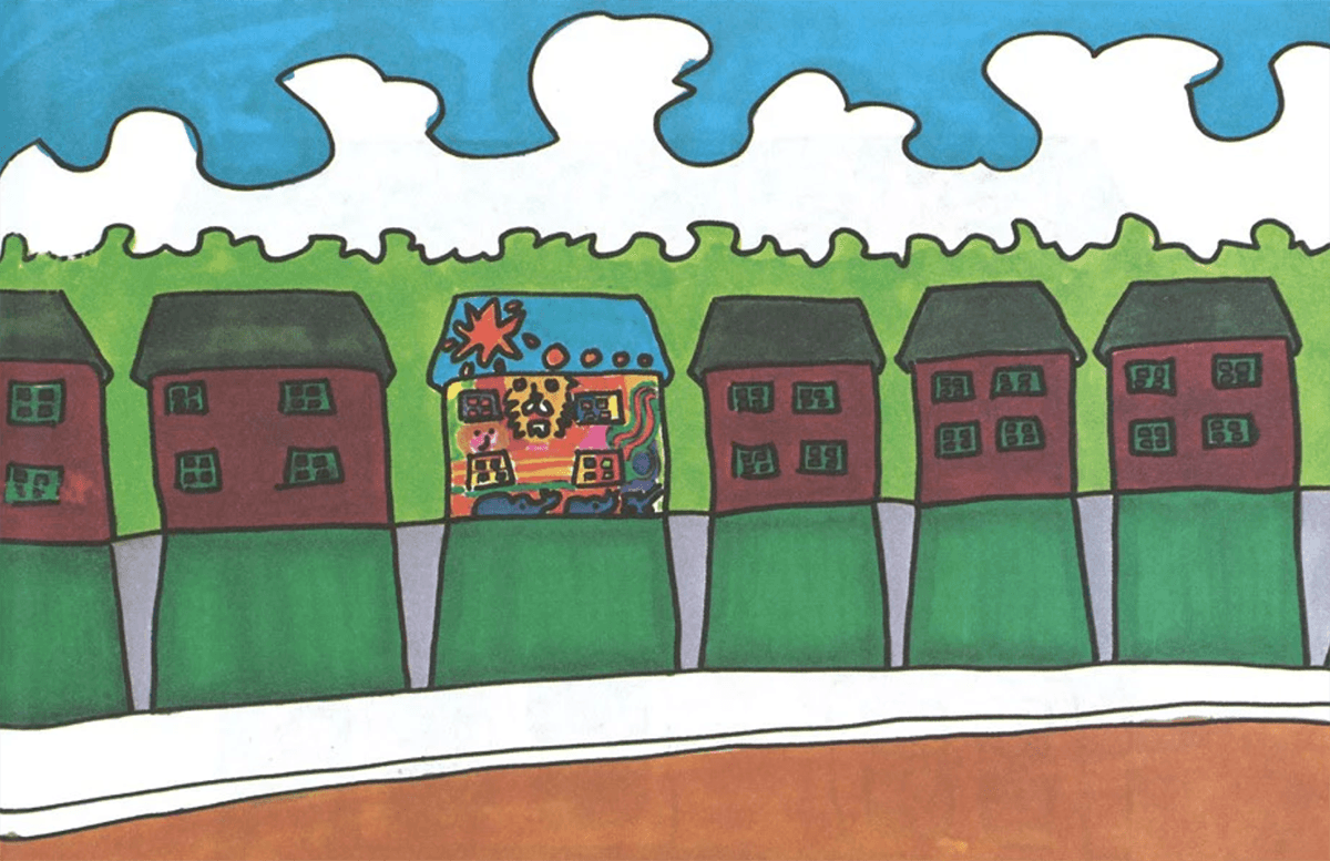 They took it upon themselves to visit and ask him to change his house back, so they could have a neat street again. But as each one visited and stayed up late drinking lemonade and chatting with Mr Plumbean, more and more of the houses started changing, until every house on the street was different to the next.