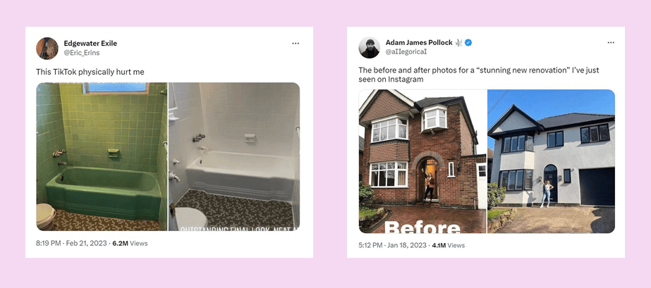 In February 2023 TikToker @chloeisag coined the term “millennial grey” through a video about finding a grey bathroom in a Mexican restaurant. “It’s giving sponsored by Hobby Lobby,” she sang, “it’s giving house flipping … It’s giving airport”. More than three million people saw the video in five days, and now millennial grey has its own entry on Knowyourmeme. Examples of the meme show before and afters of renovations, where the befores are spaces with character features, and the afters are grey and described as “soulless”.