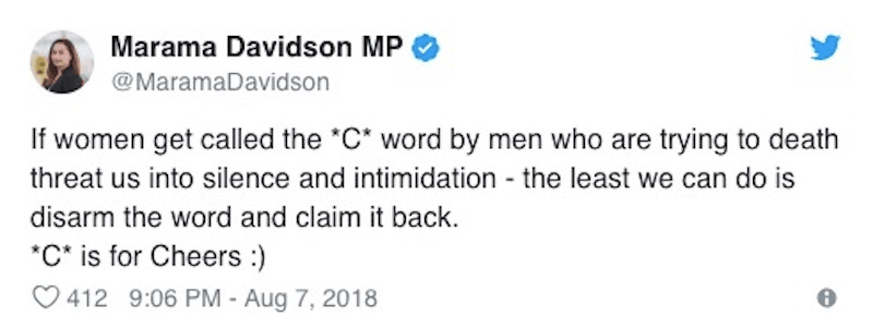 Marama Davidson, dat you? We all remember last year when she reclaimed the word “cunt” repeatedly at a public event, upsetting many. “I stand by using that word,” she told Newshub. “That word is a powerful word for women and shouldn’t be used as abuse.” Good cunt.