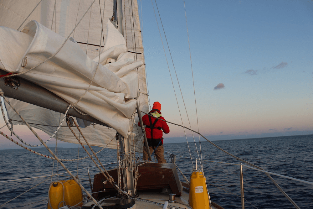 With three aboard we kept an informal roster of watches. Ken would take the helm from dinnertime until midnight, then Haddon would take over, prodding me out of my sleeping bag before dawn. Aside from the odd tweak of the sails and glance at the chart, watches were mostly spent gazing at the horizon. One morning while rounding North Cape I spotted a humpback whale breaching, and over the other shoulder, an albatross gliding impossibly low over its own reflection. They were postcard scenes, but with the chance of making eye contact.