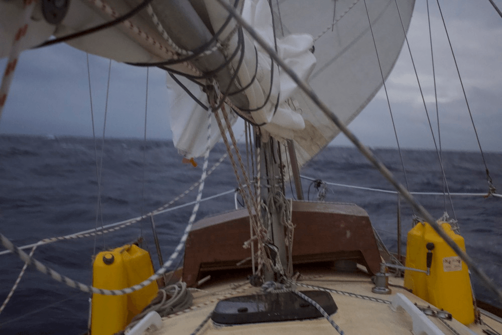 By the fourth day, the change in swell direction produced a yaw that made it impossible to sleep. On the fifth, with Taranaki lying low beyond the eastern horizon, the wind strengthened, sweeping the sea into mounds that approached side-on. Sometimes a wave would slosh into the cockpit or crack against the side of the hull. Sliding back and forth across the bunk, nauseous and a bit spooked, my mind conjured giant waves and sinking ships, benthic horrors of billowing hair and bubbles.
