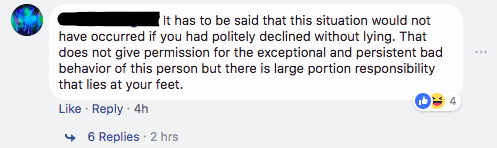 “We did not owe that man anything, and yet in his eyes, we did. I can’t stop thinking about what he would be like in a relationship. Would he feel entitled to tell his wife what clothes to wear? Would he feel entitled to have sex with her whenever he wanted? Would he feel entitled to hit her when she refused?