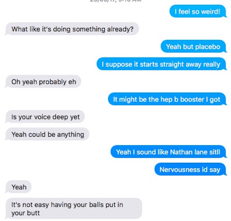 The feeling didn’t go away immediately after the shot either. I text my cister, Ruby* that I was still feeling strange. Every twinge in my leg was a new hair growing suddenly, a scratch in my throat meant I was Morgan Freeman already. I’d never felt so hyper-aware of my body.