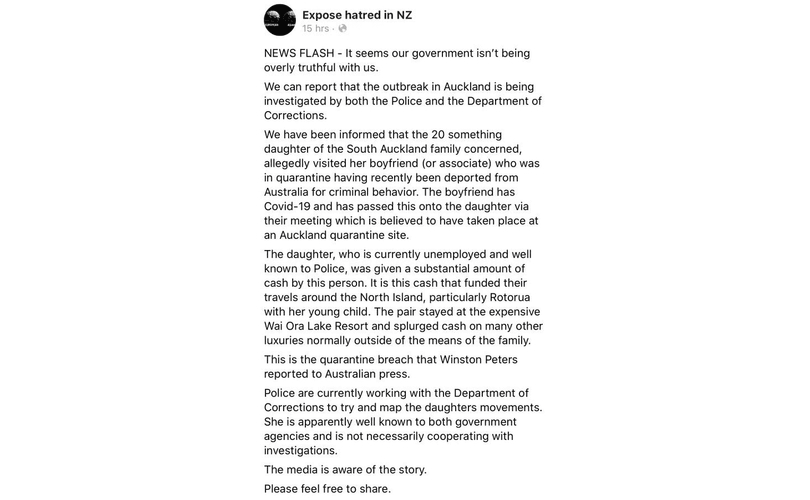 Hipkins was referring to a post that had gone viral on Facebook, alleging the virus’s resurgence in New Zealand was due to a young woman infiltrating a quarantine facility.