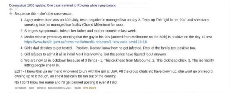 By the time I started looking into the racist conspiracy theory flying around Facebook about the source of Auckland’s resurgence of community transmission, many were already making the link to a Reddit comment from a little earlier.