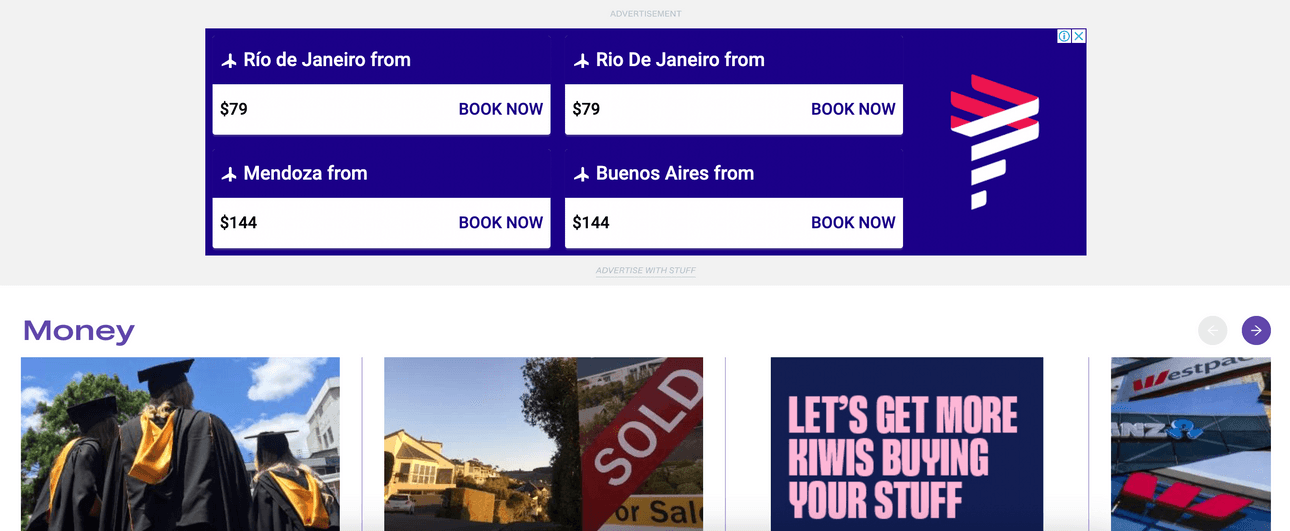 News website Stuff has blocked adverts appearing on its homepage that purported to show flights could be purchased to South America for as low as $79.