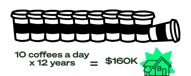 Why stop at one less coffee? Not buying one coffee won’t get you a house deposit any time soon. But not buying 10 coffees every weekday for 12.3 years will save you $160,000. Save smarter, not harder.