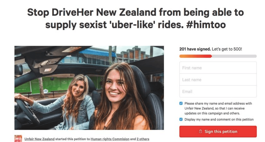 Yesterday, a feeble troll of a petition on Change.org announced that the new women-only ride-sharing app DriveHer was “sexist” and “denying men jobs.” The app, launching in Auckland on December 3, has an all-women roster of drivers. There are also strict rules around male passengers – no travelling without a woman, and no sitting in the front seat. “DriveHer is about giving women options,” founder Joel Rushton told The NZ Herald. “It’s about giving women an option to feel safe, because what we know is that the taxi and ridesharing industry isn’t safe.”
