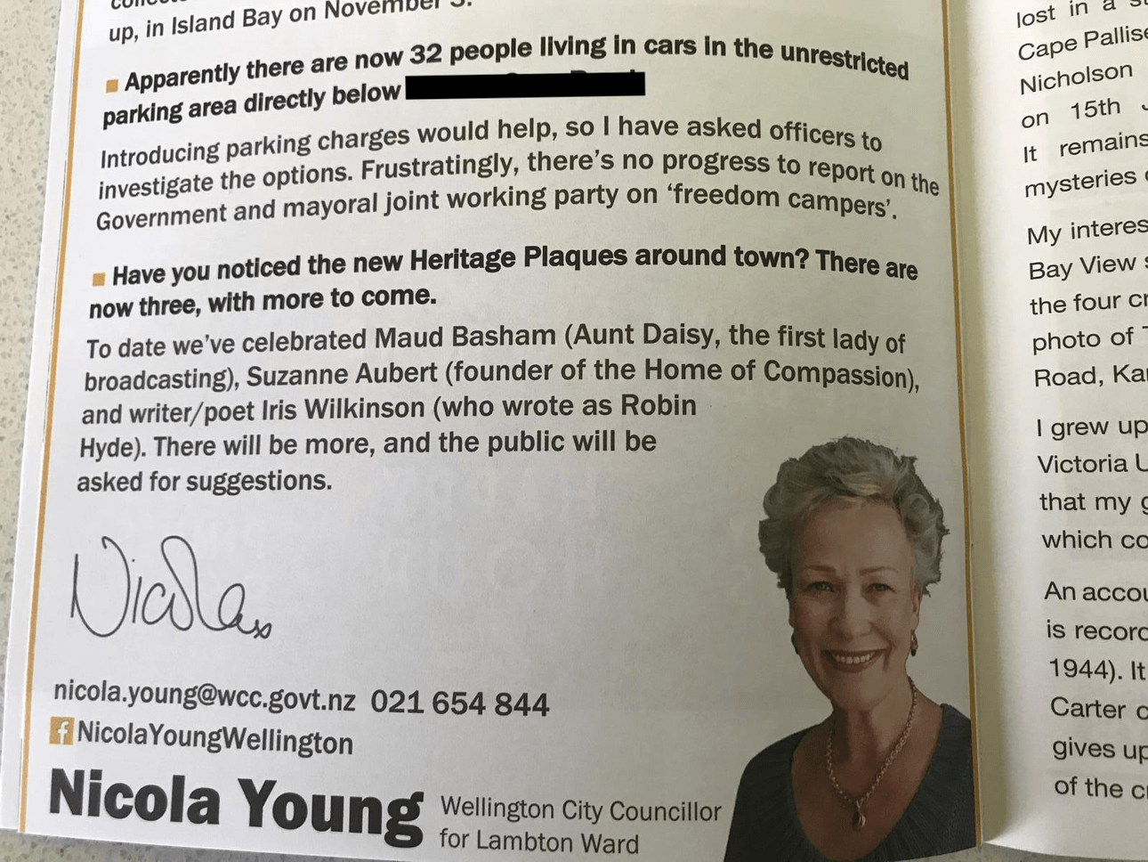 “Apparently there are now 32 people living in cars in the unrestricted parking area directly below X Road*” the flyer from Wellington City Councillor Nicola Young said. Shockingly, what followed next wasn’t an appeal to support them as the Christmas period begins. Instead, Nicola Young was attempting to re-brand those homeless individuals and families “Freedom Campers”.