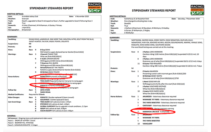 Across the ditch the day after, on November 4, two New Zealand horses had similar tragedies at the Avondale Jockey Club in Auckland. As recorded in the stewards’ report, three-year-old gelding Hand Over sustained a shoulder injury in race number one and six-year-old gelding Forgetz fractured his leg in race number five. Neither of these conditions could be treated, and both horses were euthanised. Three days later, on Saturday November 7, the stewards’ reports show seven-year-old gelding Kamanda Lincoln was euthanised after his race at Riccarton in Christchurch. As far as I can see, there has been no reporting of any of these deaths in the mainstream media.