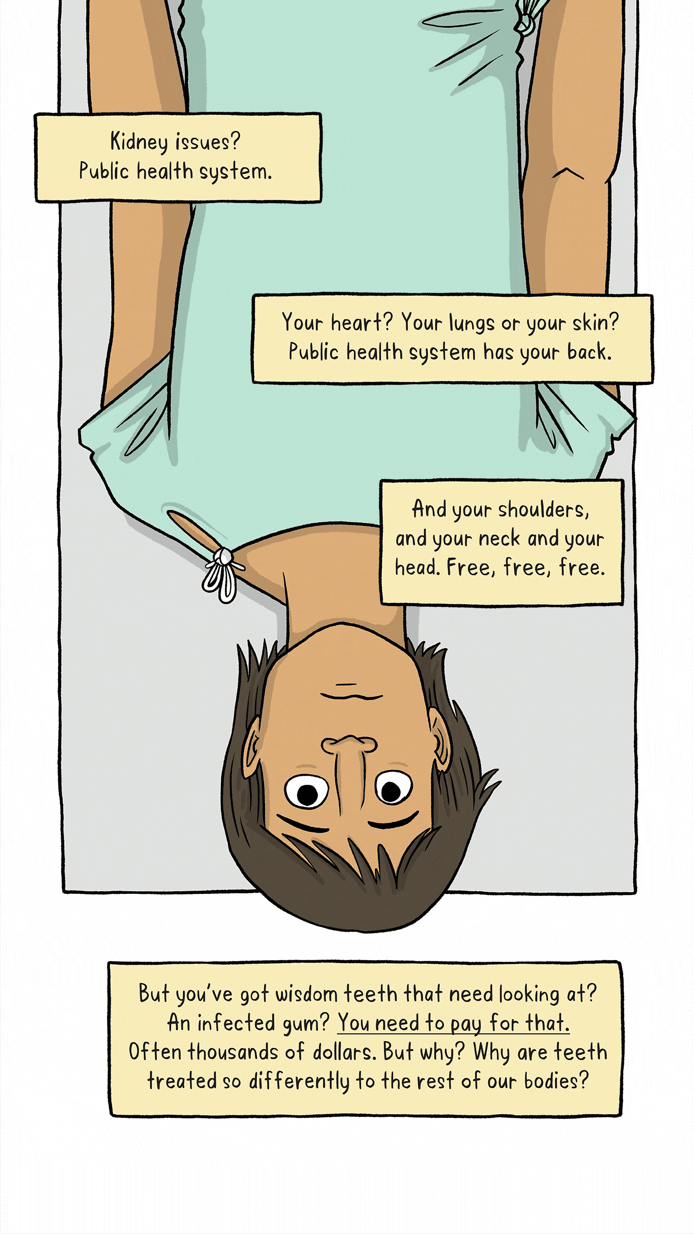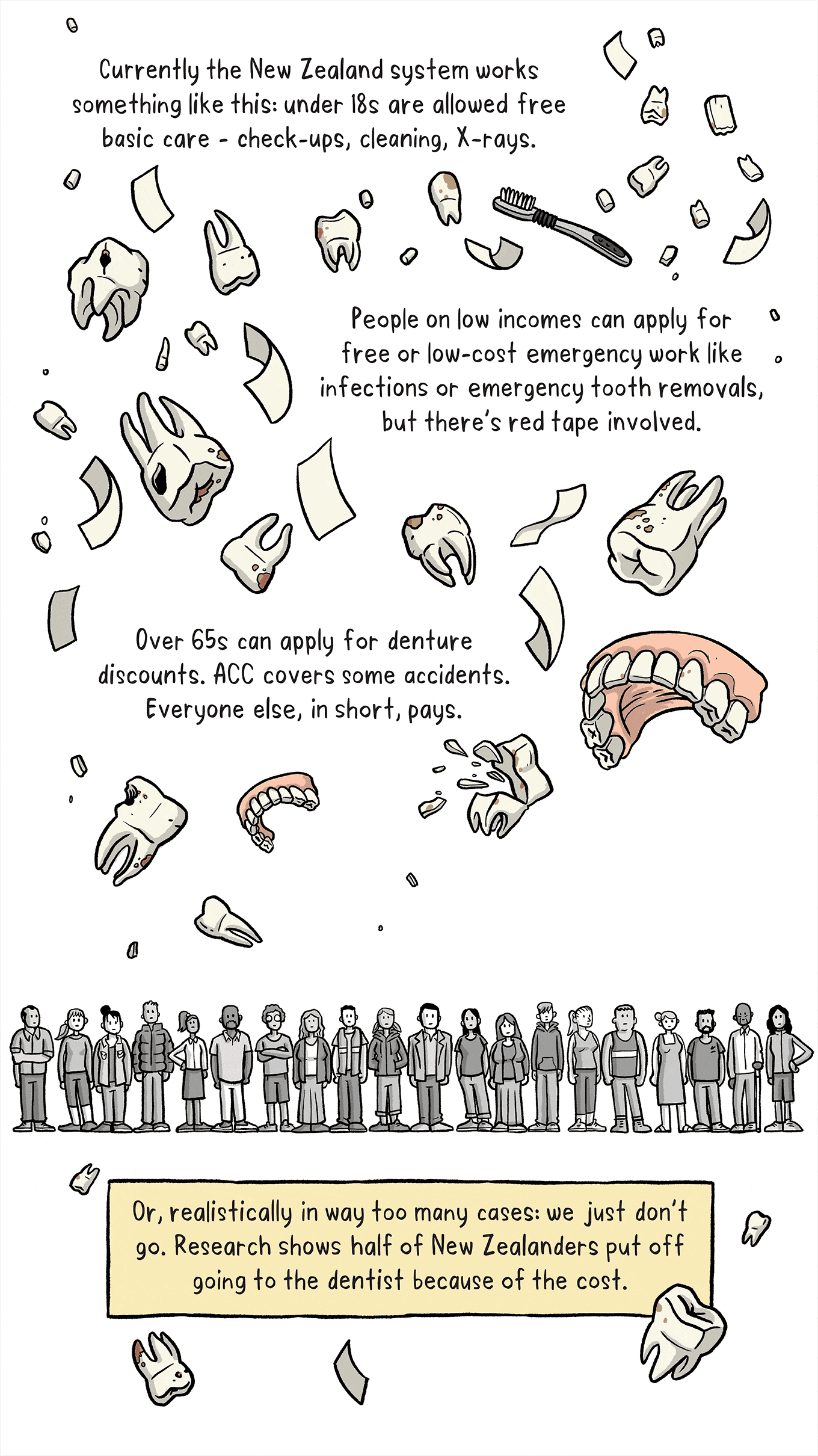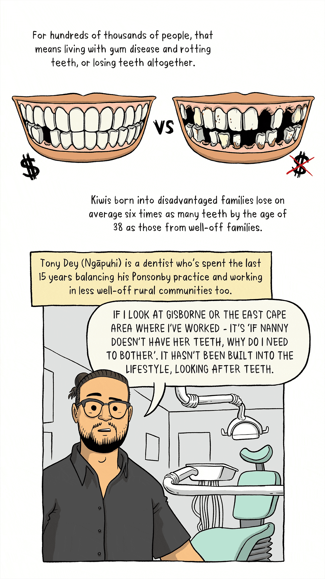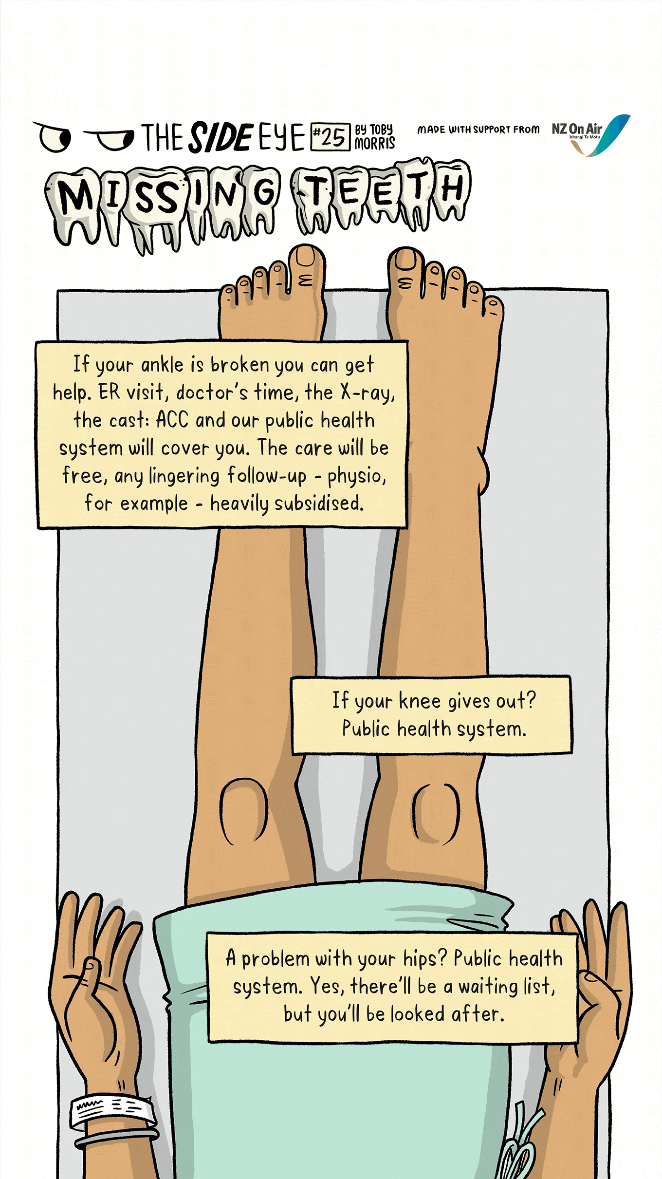 Share Story×Share StoryFacebookTwitterBlueskyRedditEmailLinkedinWhatsappMessengerImage: Toby Morris We’ve all got teeth, so why can only some of us afford to look after them? First published March 2020 The Side Eye is a monthly non-fiction comic by Toby Morris, supported by NZ On Air. Read the rest of the series here.